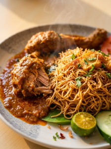 The Mee Siam noodles are perfectly cooked, soft yet springy, absorbing the tangy, slightly spicy sauce that defines this beloved dish. The rendang chicken is marinated in a blend of aromatic spices, coconut milk, and slow-cooked to achieve a tender, melt-in-your-mouth texture. Together, the noodles and chicken create layers of flavor — rich, savory, slightly spicy, and utterly satisfying. A garnish of fresh herbs adds a bright, fragrant finish that elevates every bite.